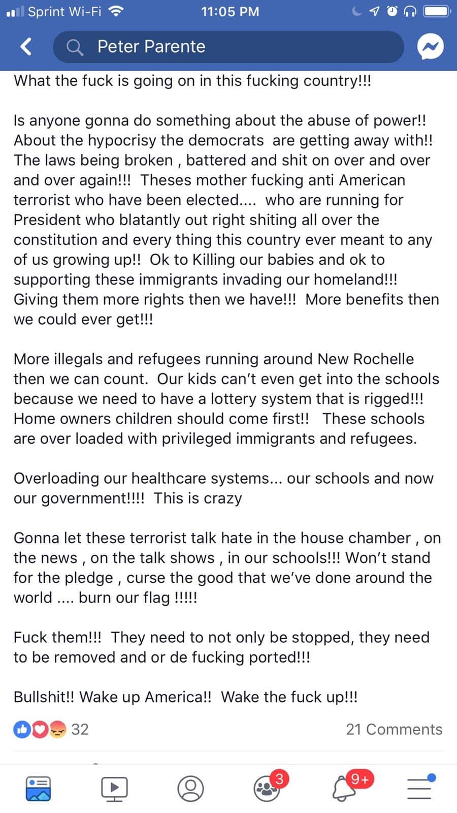 “More illegals and refugees running around New Rochelle than we can count,” said Parente. “Our kids can’t even get into the schools because we need to have a lottery system that is rigged!! Home owners children should come first!! These schools are overloaded with privileged immigrants and refugees.”