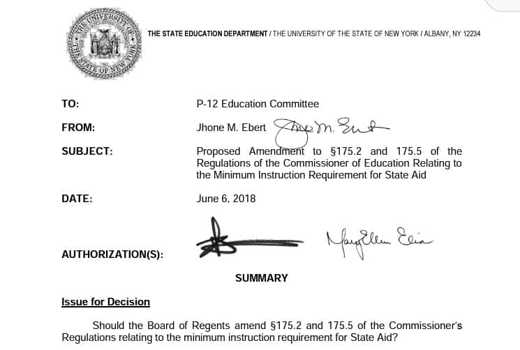 In 2017, the New York State Education Department’s P-12 Committee, led by Senior Deputy Commissioner for Education Policy Jhone M. Ebert, undertook a response to several factors to revise the 180 Day Requirement for schools in New York State.