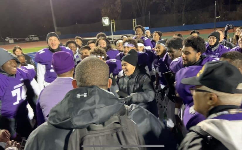 EDITOR’S NOTE: I am not a sportswriter so I leave that to others. My intention was to give readers who could not make it to the game which was not just a game given the Coach D situation. I could describe it but instead I took various video clips from the day and compiled them. The video is about the game – I managed to be filming game action and some critical moments for the Huguenots but mostly I wanted to take readers on the field immediately after the game and to the locker room where players and coaches celebrated with family, friends and fans.