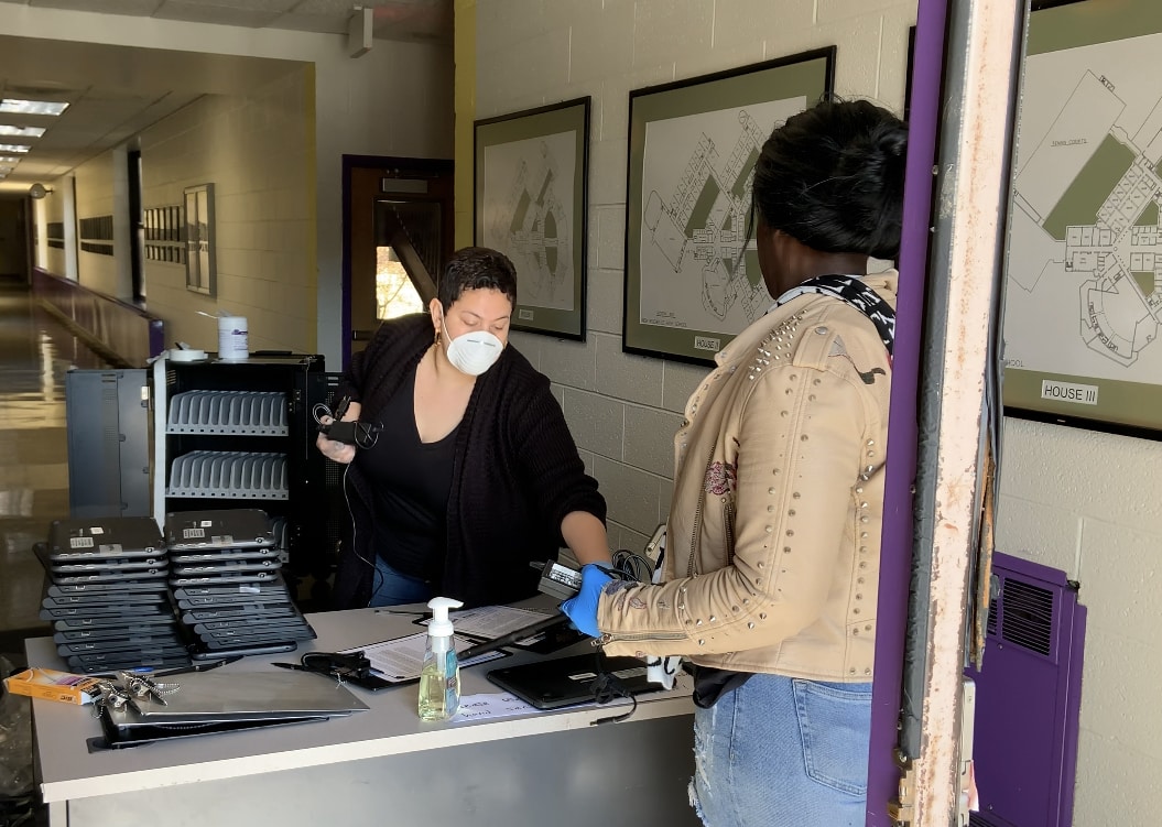 The Chromebook exchanges occur without hand to hand to contact but also without setting up two tables set up to create 6 feet of distance between worker and client. There is a two step process which requires a client to enter, leave, then return. This “double-dipping” should be eliminated.