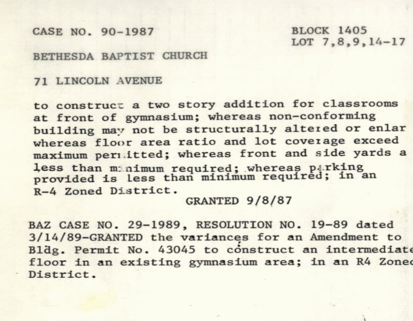 According to New Rochelle Building Department records, Bethesda Baptist Church was issued Building Permit BP-2005-0462 for a “two-story front addition and interior second floor addition and alteration/renovation to an existing church school”. The building permit was closed on December 31, 2008. A Certificate of Occupancy was issued on April 15, 2009.