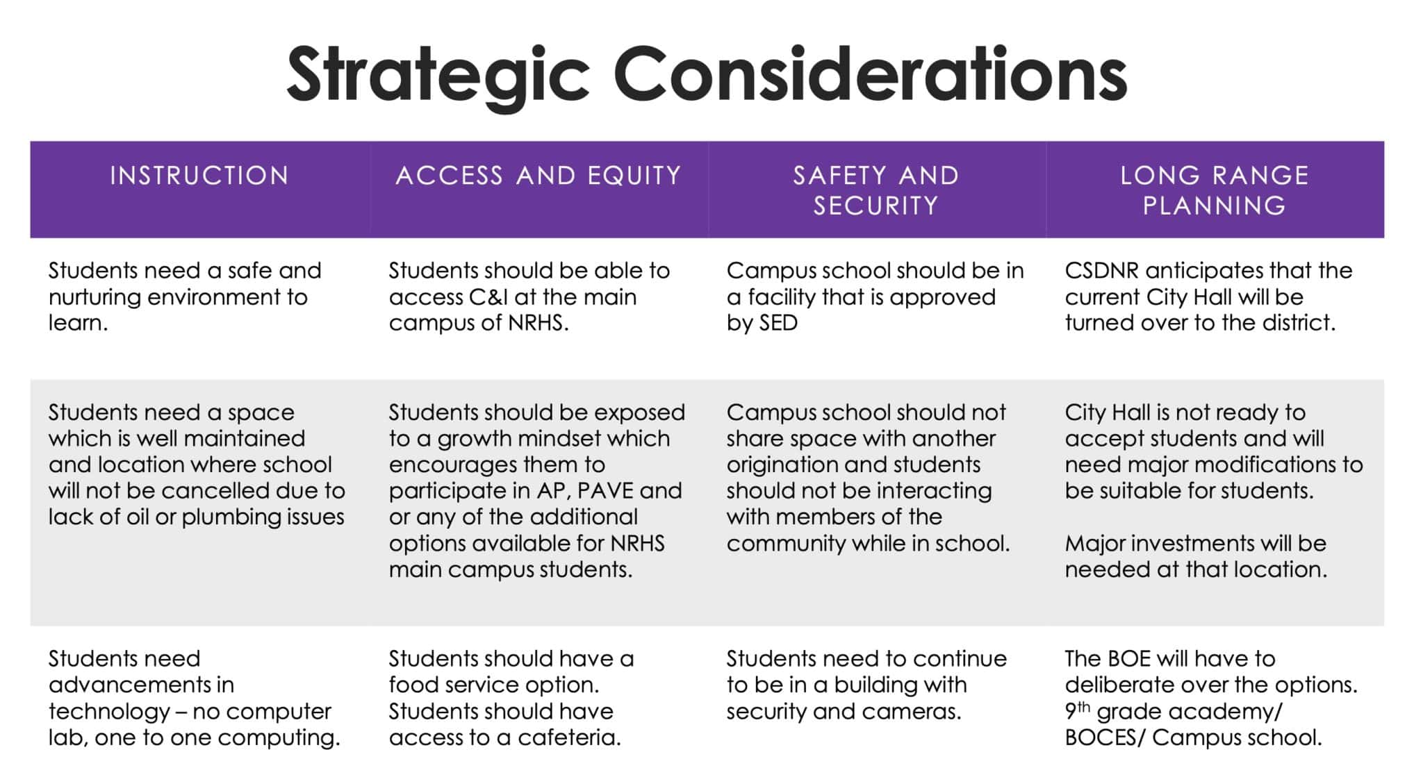 With an agreed upon framework based on the criteria, a realtor could have been hired to identify locations that met the criteria. The candidate properties could have been evaluated and scored by the District-Wide Healthy and Safety Committee and the scored list of all available properties evaluated by the New Rochelle Board of Education. The final published list of candidates would each receive a site visit from board members and then a public discussion about the pros and cons of the various options. If necessary, the District could have negotiated short-term exclusives with the finalists to allow for a public discussion.