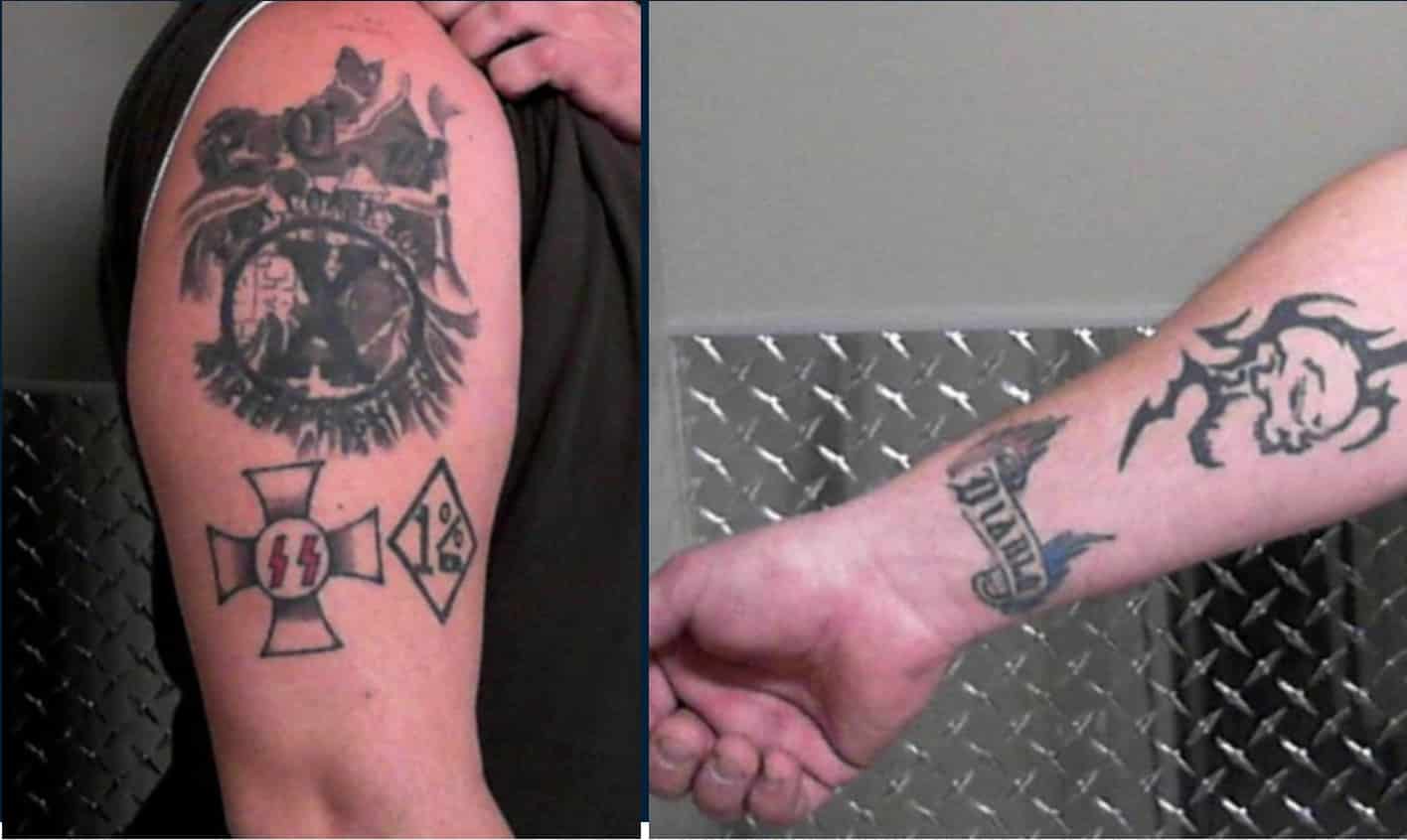 weighing 220 to 240 pounds with blue eyes and brown hair worn short, in a buzz cut. He has tattoos on his arms.