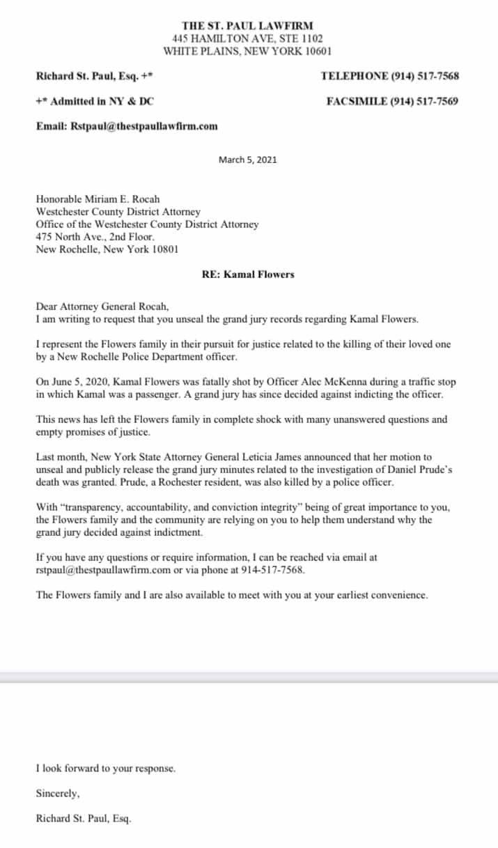 Richard St. Paul, the attorney representing the family of Kamal Flowers, has filed a formal request to the Westchester County DA to unseal the records in the Alec McKenna Grand Jury.