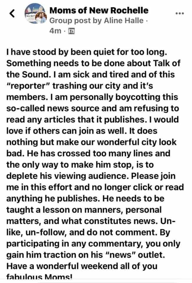 Over the weekend I offered a tongue-in-cheek response to an angry screed posted by Ms. Halle Misner in the Mom’s of New Rochelle Facebook Group announcing her intention to “boycott” Talk of the Sound — and calling on other Mom’s of New Rochelle to do the same — as a form of coercion.