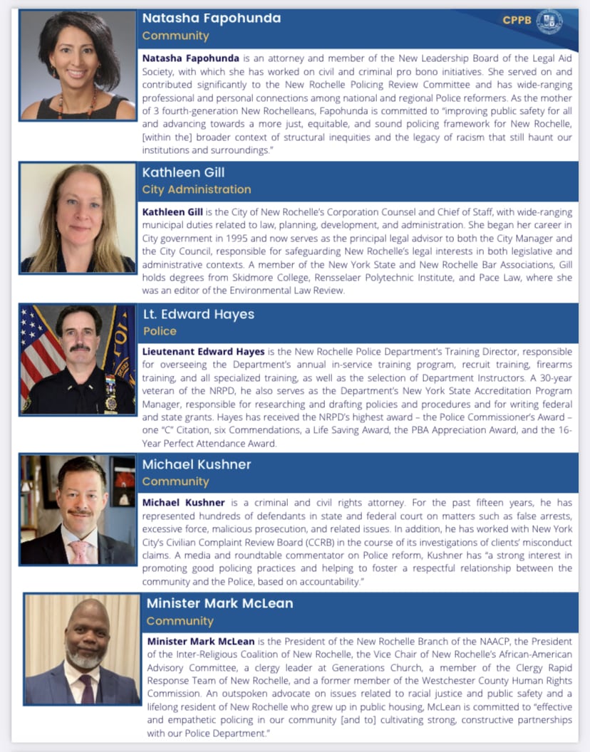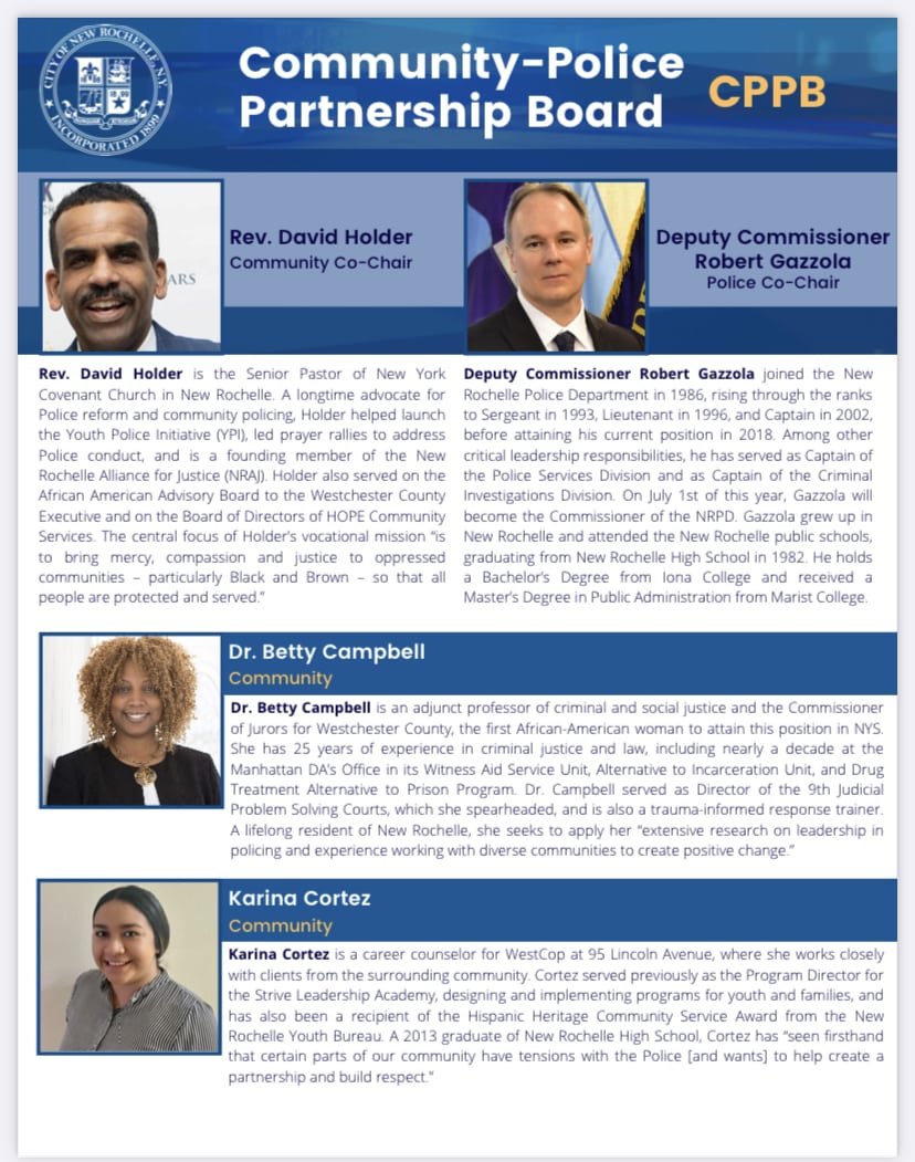 Police Co-Chair, New Rochelle Police Deputy Commissioner Robert Gazzola, said, “The New Rochelle Police Department members of the CPPB look forward to working collaboratively with the resident members of the board to address those issues directly affecting the New Rochelle Police Department, its members, and the New Rochelle community. Through this board, we look to build upon the relationships that we have cultivated over the years with our community.”