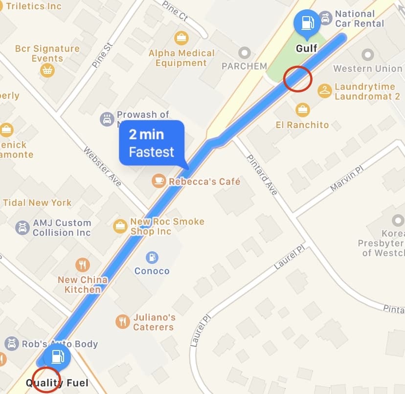 UPDATE 6/21: Based on analysis of a photo published by the New Rochelle PBA on 6/18, we assess the location of the physical altercation occurred on the Main Street side of the Gulf Express (Gulf) gas station located at 635 Main Street in New Rochelle, just over a half-mile from the Super Gas (Quality Fuel) gas station at 720 Main Street in New Rochelle.