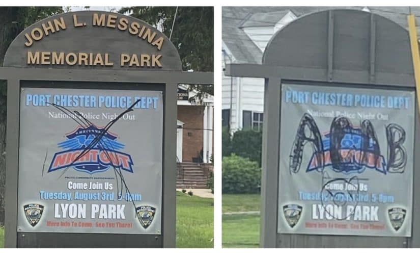 PORT CHESTER, NY — Two banners promoting National Night Out with the Port Chester Police Department were vandalized last night.