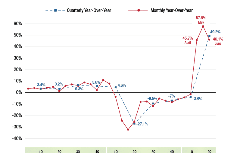 Year-to-date, statewide local collections in 2021 are up 18.8%, or nearly $1.5 billion, over the first six months of 2020. Such results, where nearly every region in the state saw a surge in collections, may reflect a combination of pent-up consumer demand, along with purchases tied to recent spikes in home sales.
