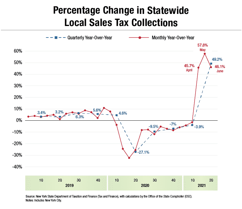 ALBANY, NY — Sales tax revenue for local governments in New York state rose by 49.2% in the second quarter (April to June 2021) compared to the same period last year, a dramatic increase from last year’s weak collections during the first wave of the COVID-19 pandemic, according to State Comptroller Thomas P. DiNapoli. Sales tax collections during this period totaled just over $1.6 billion and even surpassed collections reported during the second quarter of 2019, before the onset of the pandemic.