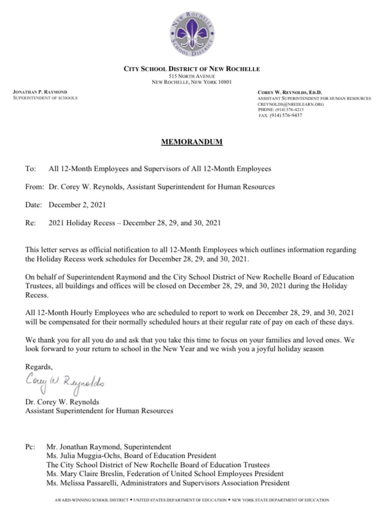 NEW ROCHELLE, NY — New Rochelle Superintendent Jonathon Raymond has decided to close all school buildings and offices on December 28, 29, and 30, during the holiday recess. The news came in a letter sent to employees last week.