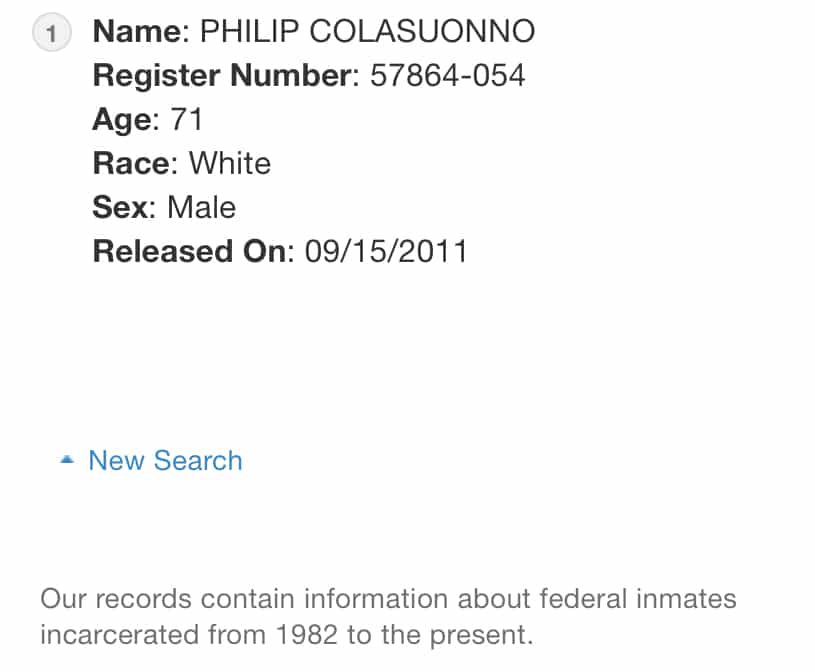 According to Federal Bureau of Prisons records, Philip Colasuonno, Inmate 57864-054, was released from Federal prison on September 15, 2011.