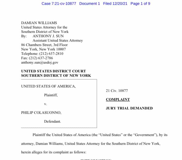 NEW ROCHELLE, NY — The United States Attorney for the Southern District of New York has filed a civil lawsuit in United States Court for the Southern District of New York against Philip Colasuonno of New Rochelle, NY.