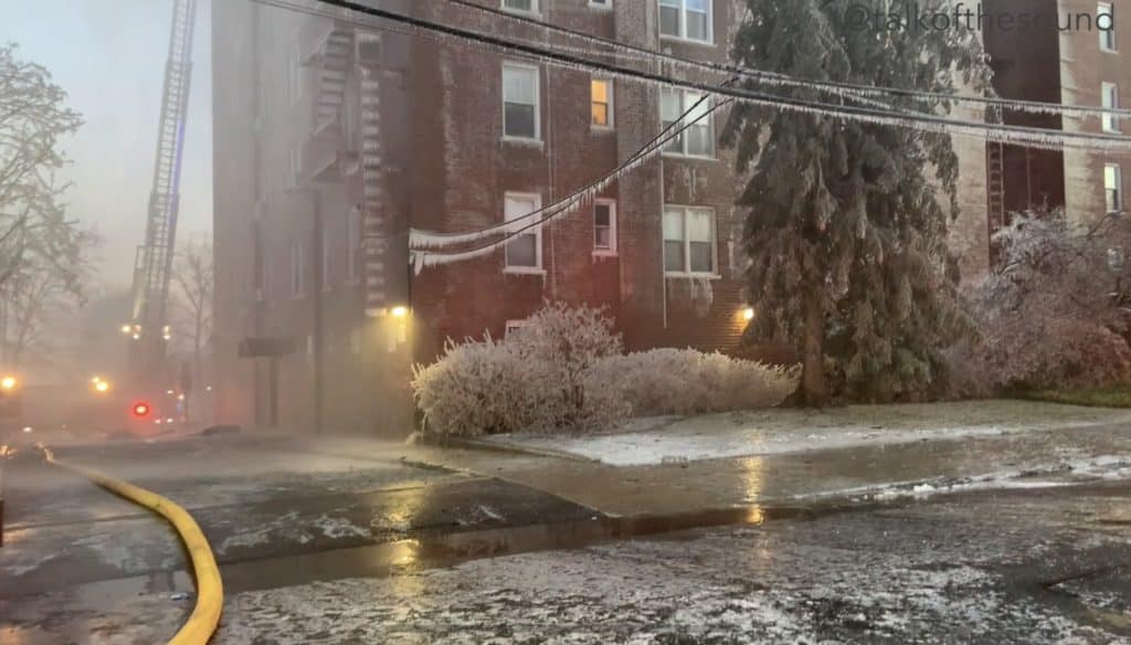With windchill, temperatures got down to zero degrees Fahrenheit. Water poured onto the fire turned the building into an ice palace.