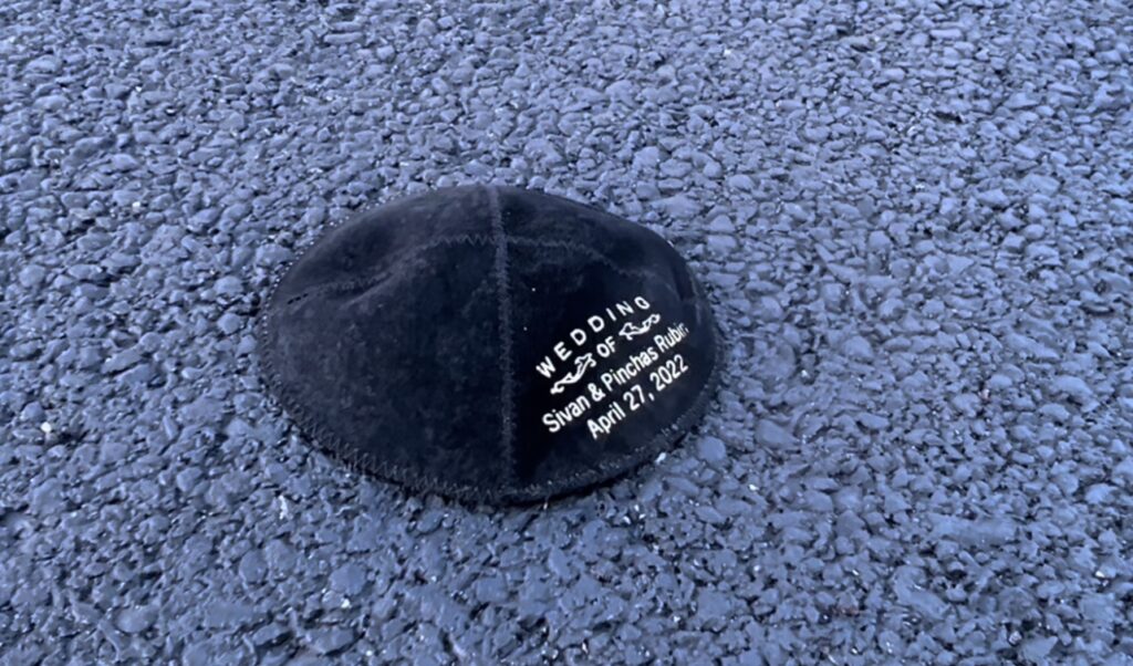 Last night the VIP Country Club hosted the wedding of Sivan and Pinchas Rubin. A yarmulke was laying on the ground in the parking lot with the names of the wedding couple and the date, April 27.