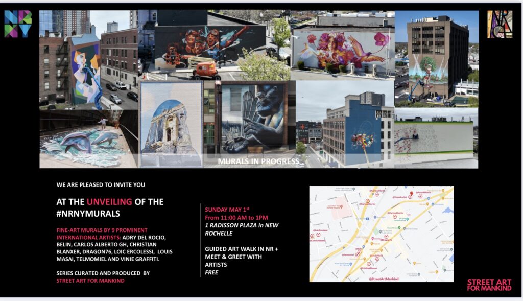 WHAT: Join us on an Art Walk through the streets of New Rochelle to unveil nine new street art murals (#NRNY Murals) created by acclaimed international artists. The inspiring walk will be led by Street Art for Mankind and the New Rochelle Industrial Development Agency, and the artwork reflects the unique creativity, diversity and forward-thinking nature of one of the largest cities of Westchester.
