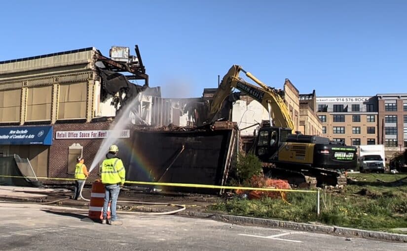 NEW ROCHELLE, NY (April 29, 2022) — The City of New Rochelle Building Department ordered an emergency demolition of the entire structure at 2 Hamilton Avenue in New Rochelle yesterday after the marquee on the Hamilton Avenue side of the building collapsed at about 6:15 a.m. Thursday. The marquee collapse pulled down the brick facade above the marquee, sending debris scattering in all directions on the sidewalk and road surface. There were no reports of injuries or property damage.