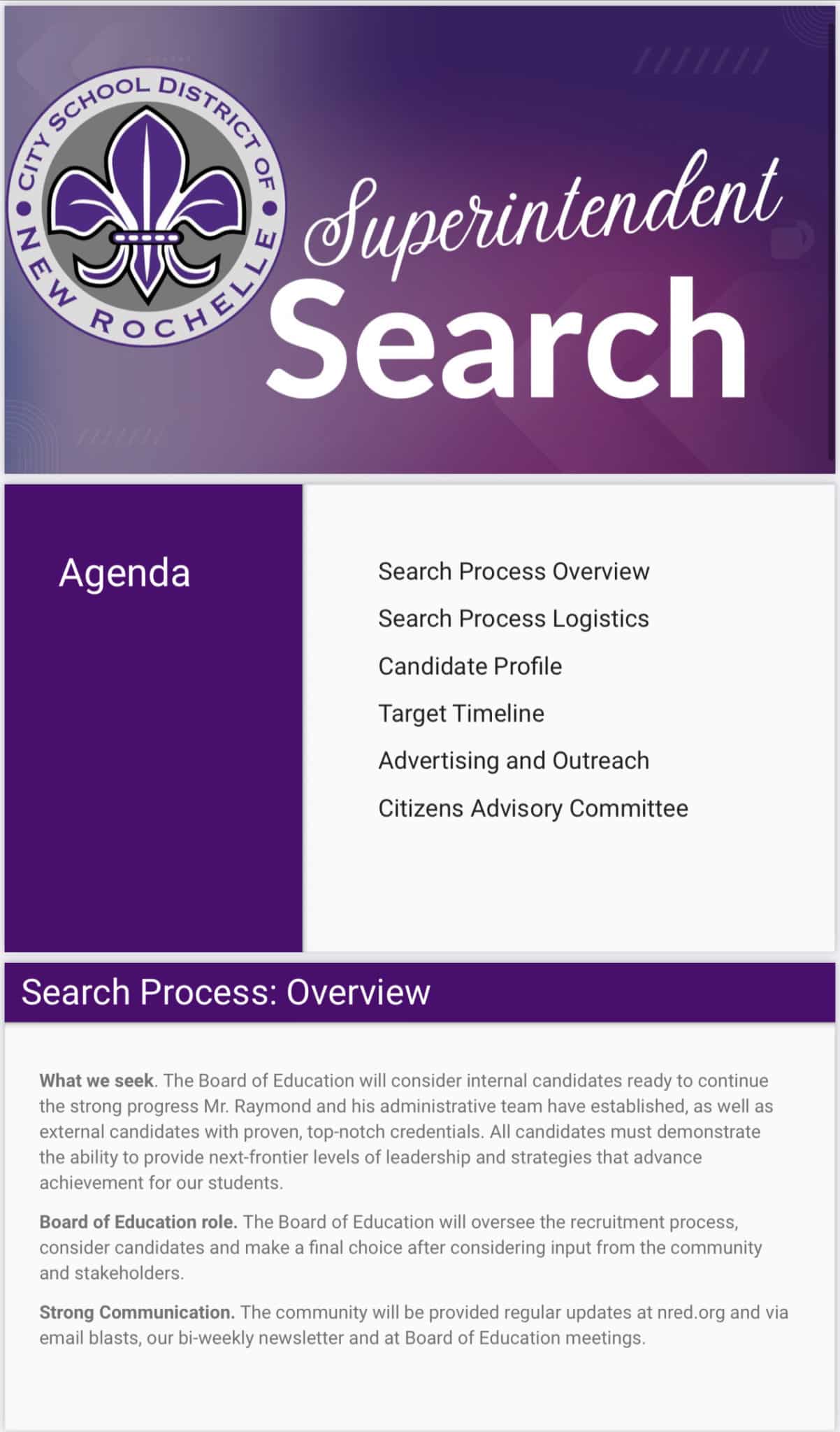 NEW ROCHELLE, NY (January 25, 2023) — The Superintendent Search by the New Rochelle Board of Education will be completed with lightening speed — in about six weeks.