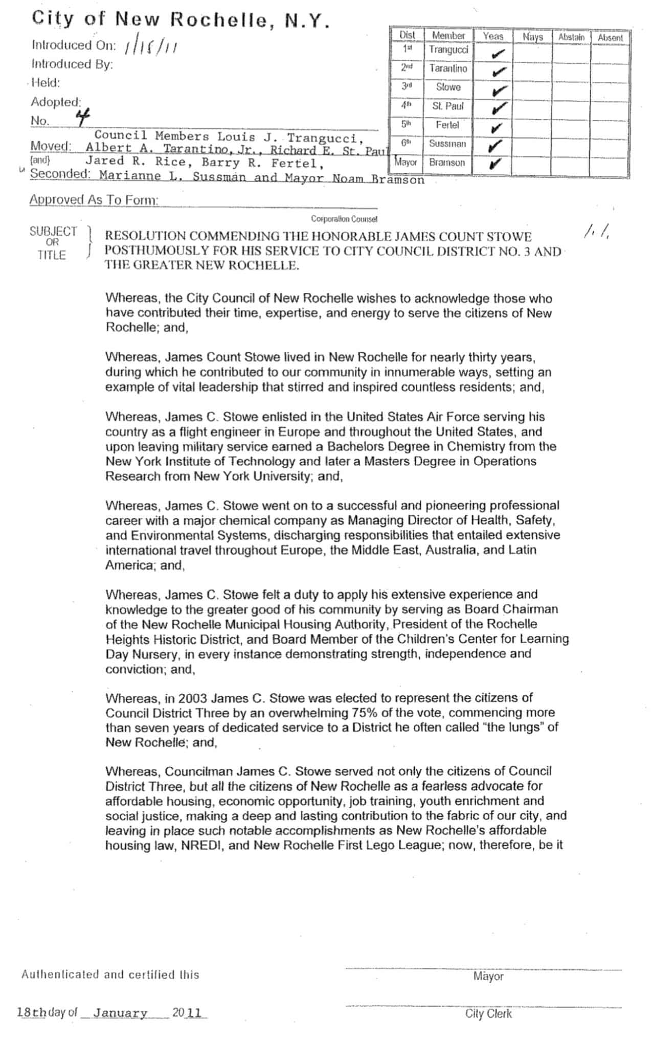 The New Rochelle City Council commended Stowe posthumously on January 18, 2011.