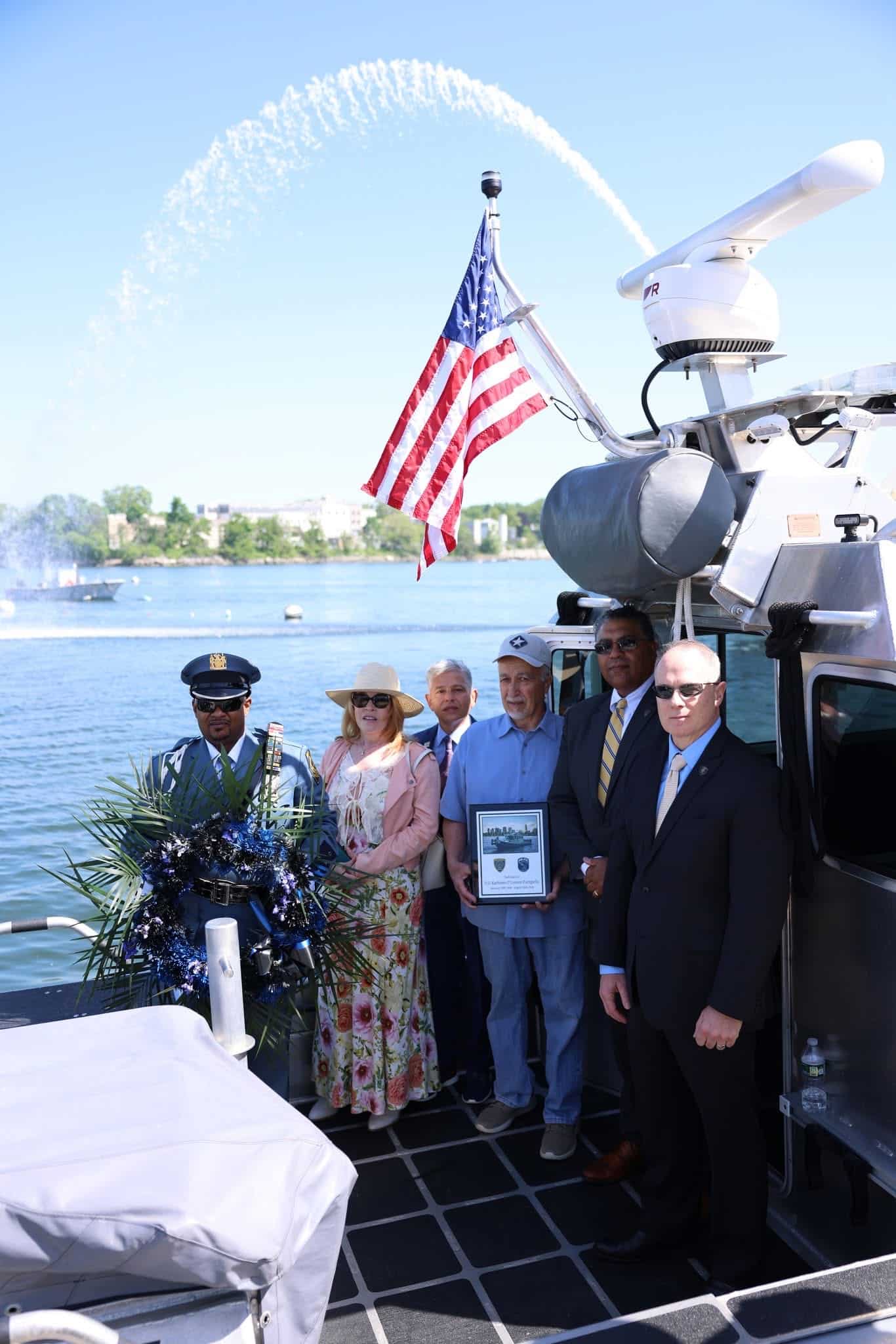 NEW ROCHELLE, NY (May 16, 2025) — The New Rochelle Police Department dedicated its newest patrol boat, Marine 2, in honor of the late Police Officer Kathleen O’Connor-Funigiello during a ceremony at the Harbor Patrol on Monday, May 12. O’Connor-Funigiello, who died in 2018 from a 9/11-related illness, was a Ground Zero volunteer following the September 11 terrorist attacks.