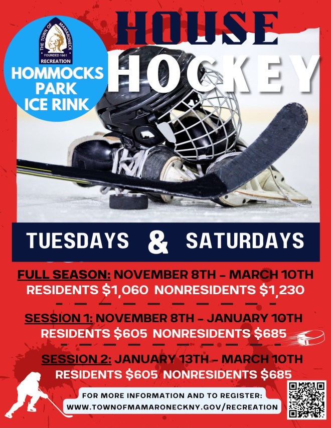 MAMARONECK, NY (October 02, 2025) — The Town of Mamaroneck is gearing up for an exciting house hockey season at Hommocks Park Ice Rink, with registration now open for the program running on Tuesdays and Saturdays. The full season spans from November 8th to March 10th, offering both full-season and split-session options for residents and nonresidents.