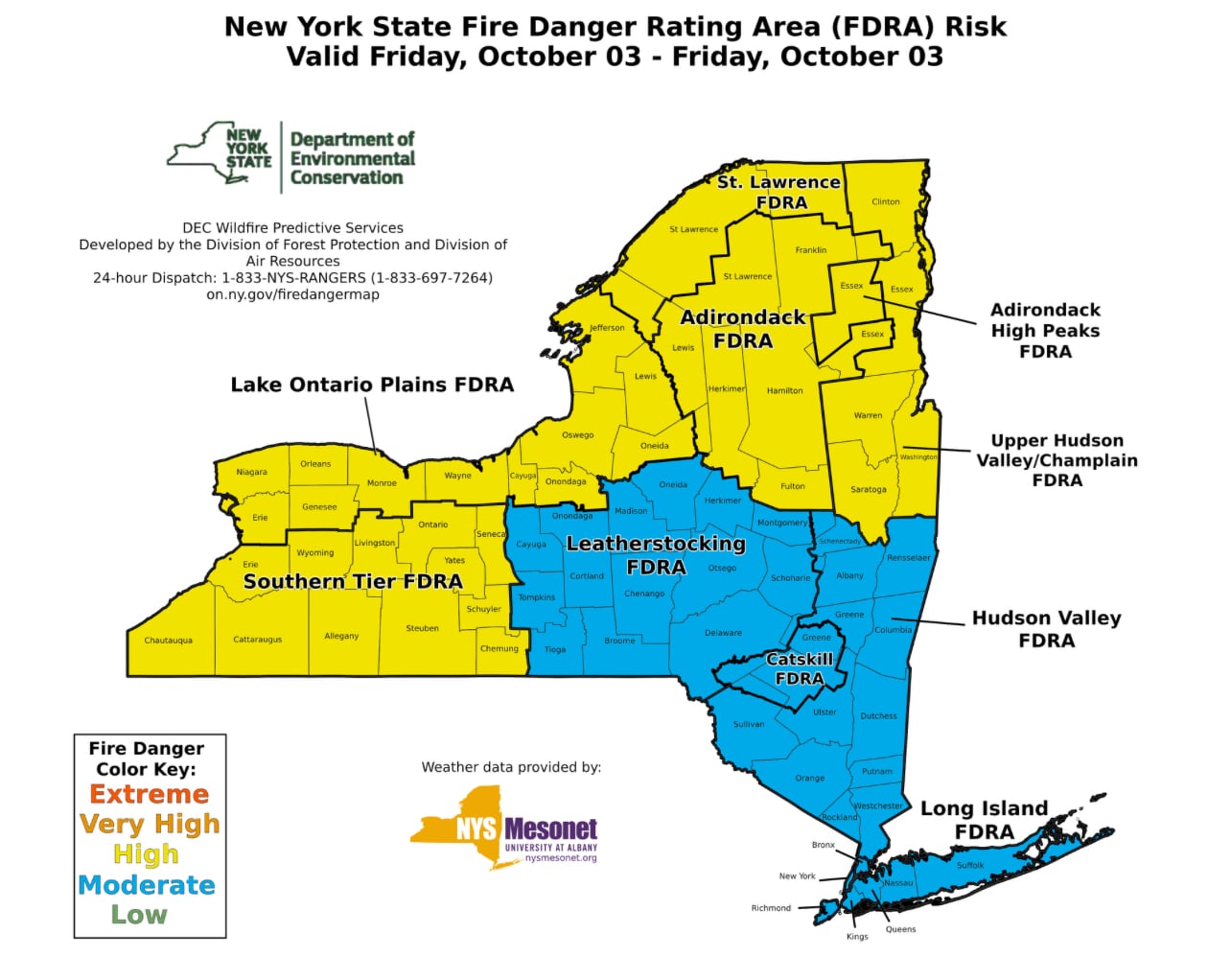 The state is grappling with a “High” fire danger rating in the Southern Tier, Lake Ontario Plains, St. Lawrence, Adirondack, High Peaks, and Upper Hudson Champlain regions, driven by gusty winds, low humidity, and a prolonged dry spell. Other areas face a “Moderate” fire danger, where fires can start from most accidental causes. Since August, New York Forest Rangers have responded to 64 wildland fires, which can escalate quickly if not addressed early.