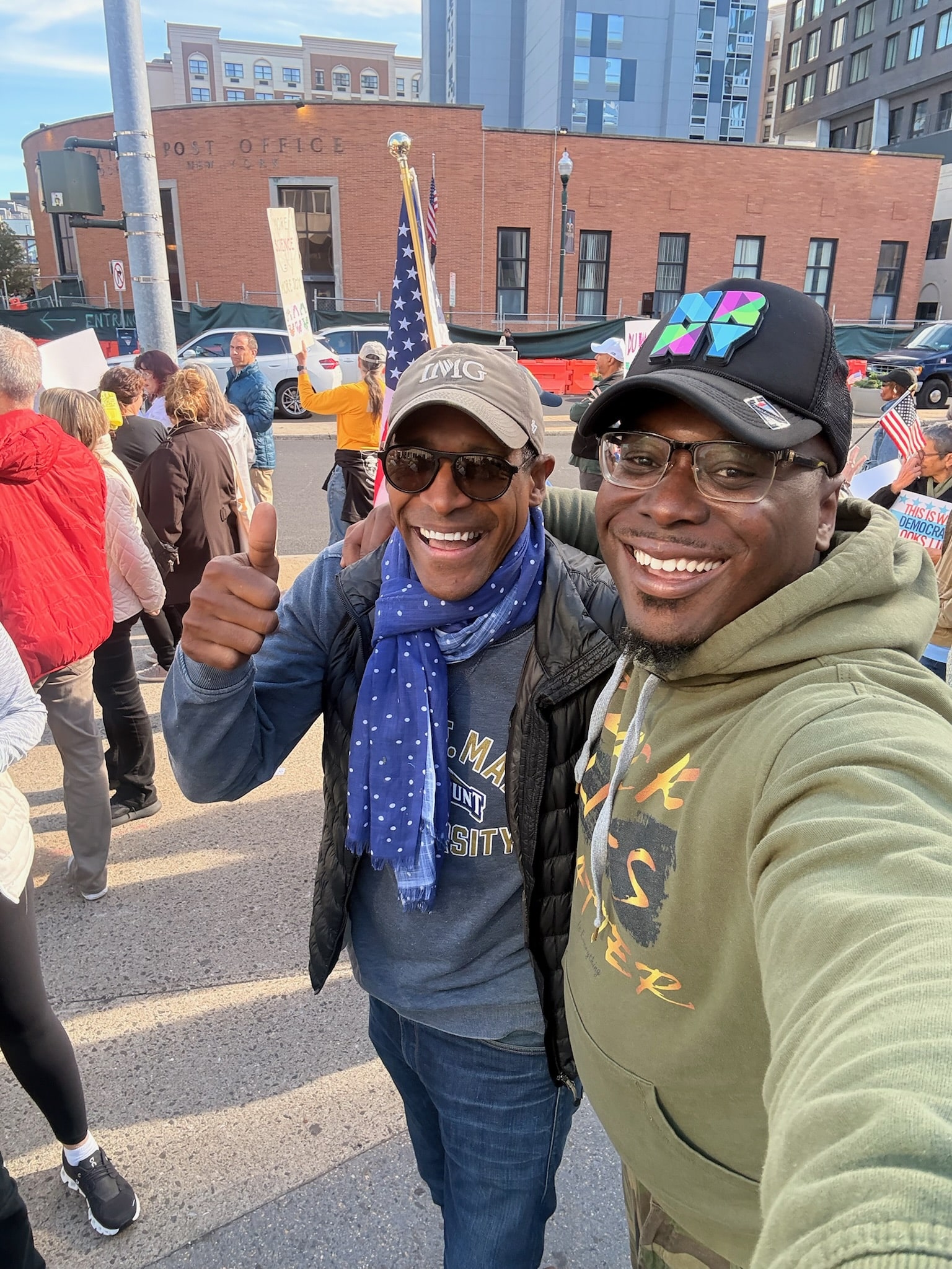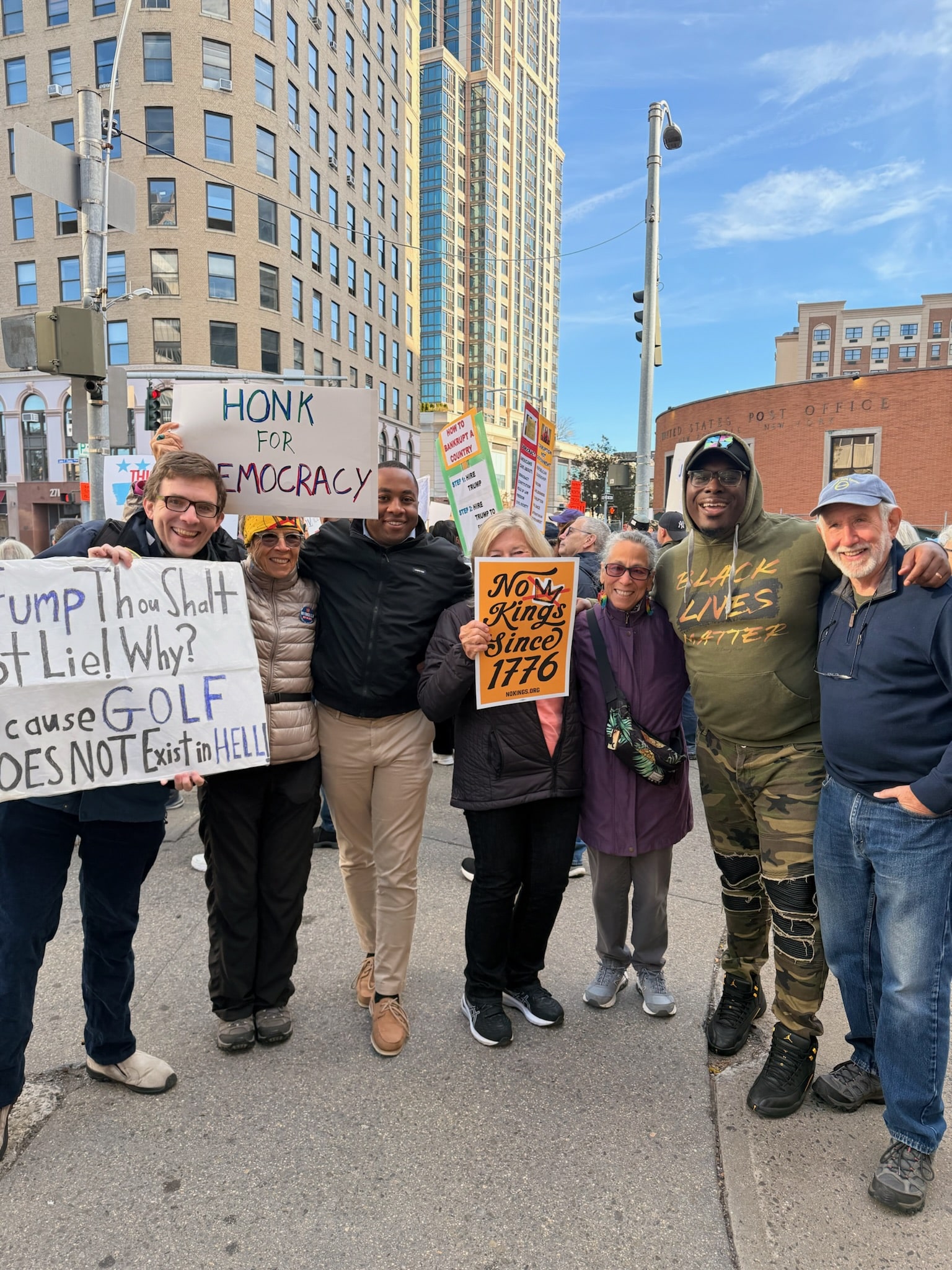 NEW ROCHELLE, NY (October 18, 2025) — Organizers in New Rochelle held the city’s first No Kings protest rally Saturday morning at the corner of North Avenue and Huguenot Street, across from the main post office, from 9 to 10:15 a.m.