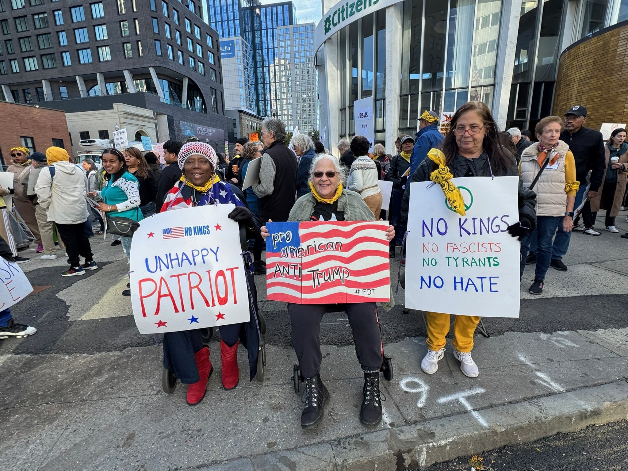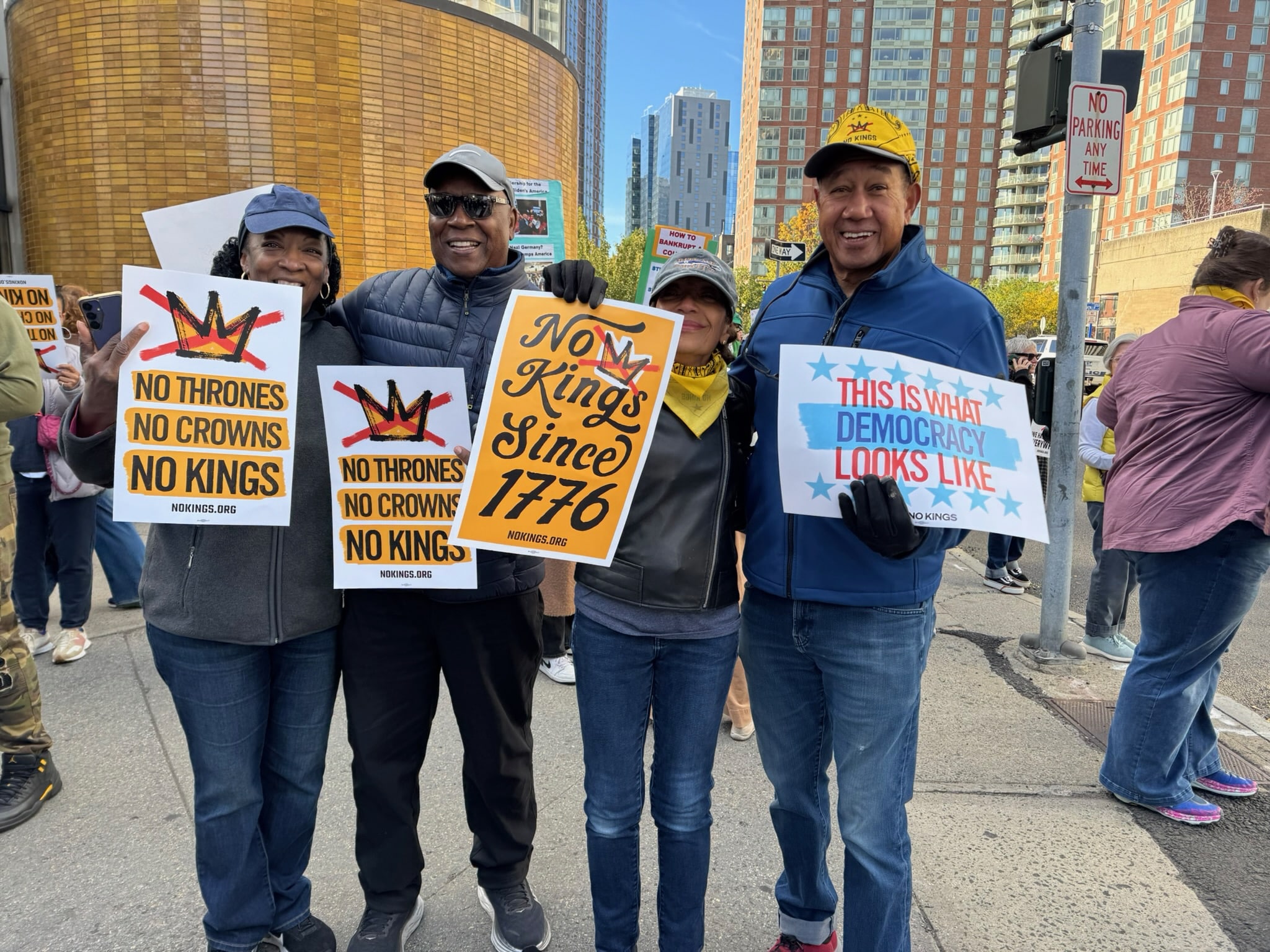 “This is our FIRST New Rochelle NO KINGS event! Join us for a rally and then get on the train for NYC!” organizers said in an announcement. Paid parking was available in the nearby train station lot, one block away, with a limited supply of posters and yellow bandanas provided.