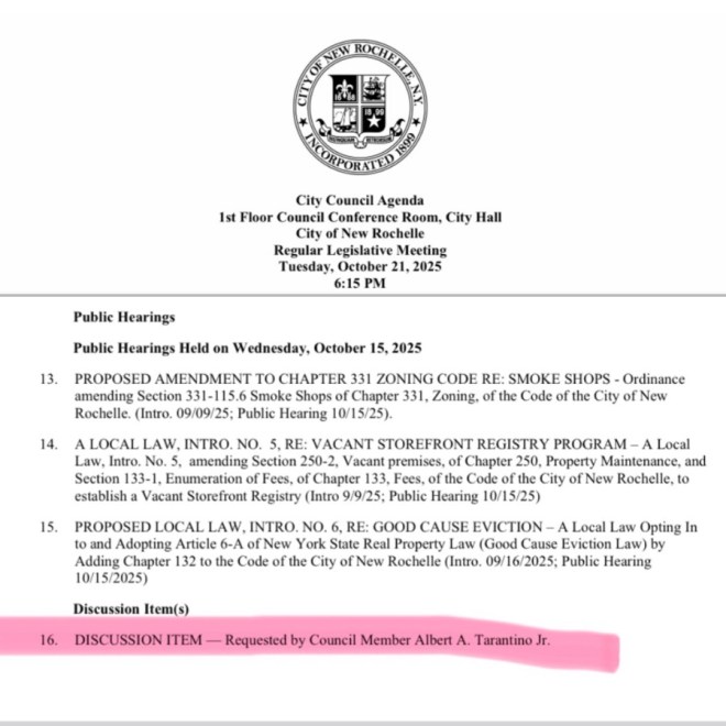 NEW ROCHELLE, NY (October 21, 2025) — The City Council will soon discuss a topic that some City officials do not want to discuss.