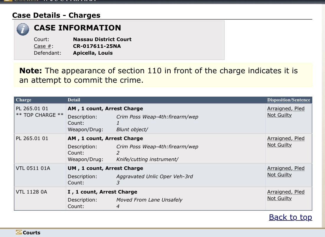 Apicella appeared before Judge Les Wright. He was arraigned on charges including attempted criminal possession of a weapon in the fourth degree involving a blunt object, a Class A misdemeanor. A second count under the same statute involves a knife or cutting instrument. Prosecutors also charged Apicella with aggravated unlicensed operation of a vehicle in the third degree and moving from a lane unsafely. He pled not guilty, and was released on his own recognizance.