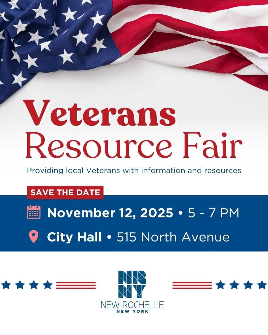 NEW ROCHELLE, NY (October 27, 2025) — The City of New Rochelle is hosting a Veterans Resource Fair on Wednesday, November 12, 2025, from 5 to 7 p.m. at City Hall, located at 515 North Avenue. The event aims to provide local veterans with information and resources.