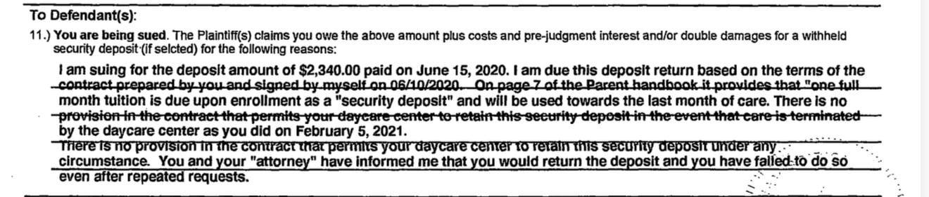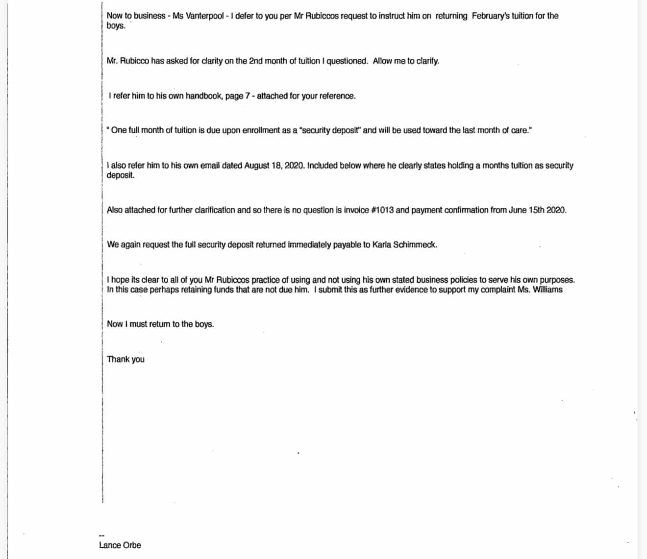 The dispute centered on a contract for summer 2020 daycare services for two foster children in Schimmeck’s care. Schimmeck paid a security deposit of $2,340, which was intended as payment for the last month of services. The daycare charged $1,200 per child per month for three days per week, with some court exhibits showing weekly rates of $1,200 and $1,140 for the two children.