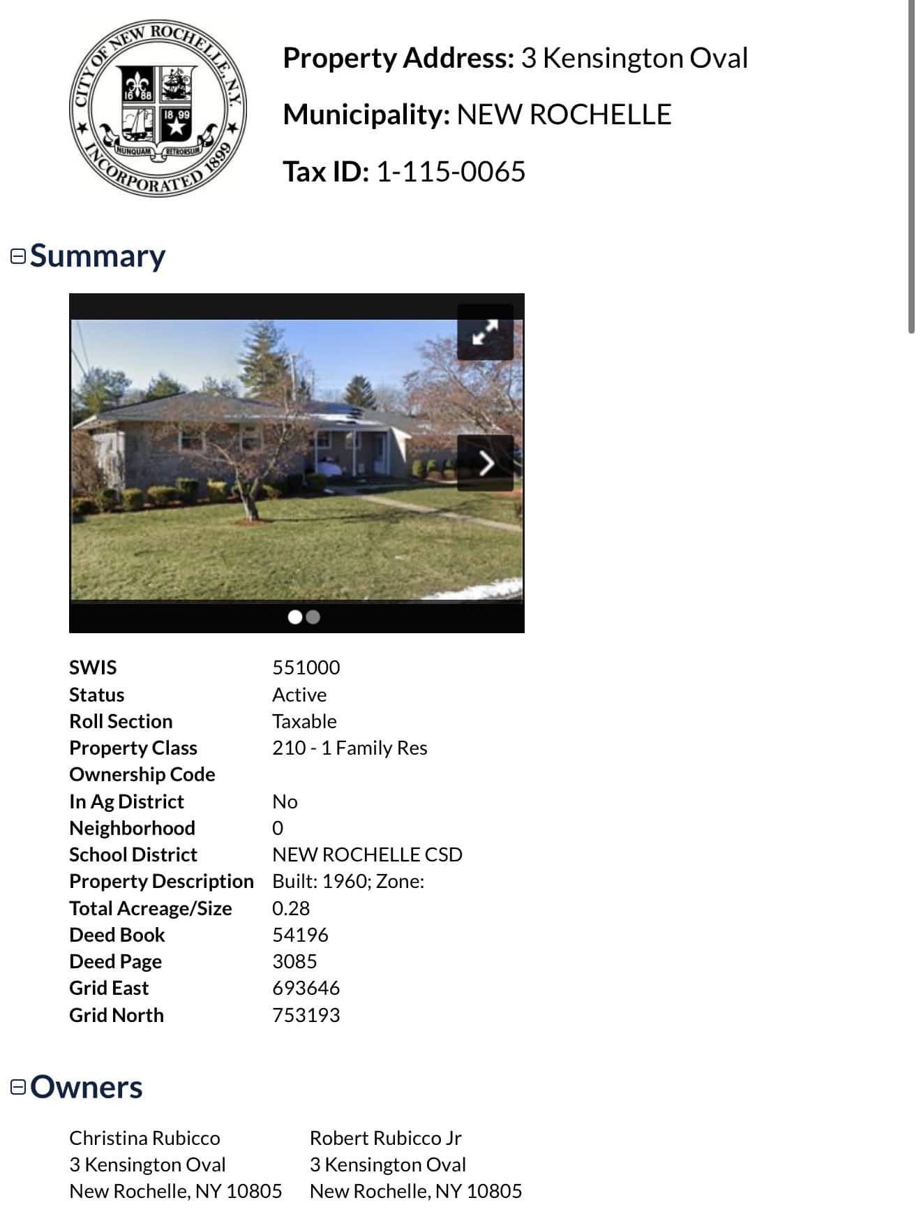The New Rochelle Property Portal states Anna Rubicco, Rob’s mother, bought 3 Kensington Oval in 2007. After she died, in 2013, her husband Robert Rubicco bought the property. In 2015, Anna’s Playhouse, LLC bought the property. Today, the listed owners are Robert Rubicco, Jr. and Christina Rubicco.