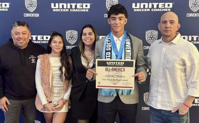NEW ROCHELLE, NY (January 30, 2026) — New Rochelle High School senior Jeronimo “Jero” Velasquez was honored at the United Soccer Coaches 2026 Convention on Jan. 17 at the Philadelphia Convention Center in Philadelphia, Pa.