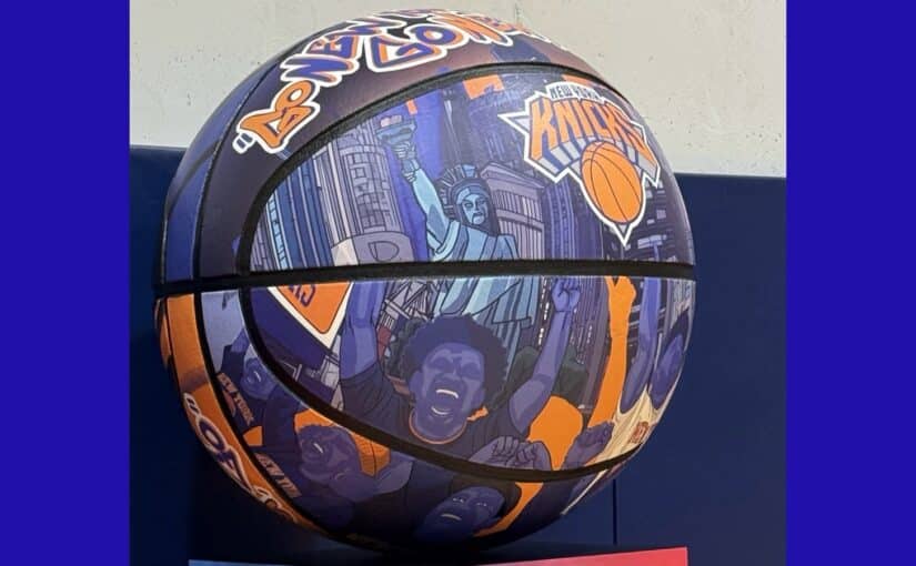 The 3-foot-diameter, 30-pound spherical artwork, created by New York native Mark Paul Deren, now resides at the club’s Remington Clubhouse. It features the Knicks logo, New York City icons including the Statue of Liberty and Brooklyn Bridge, fan faces and the chant “Go New York, Go New York, Go!” The piece is made from foam with an epoxy hard coat and wrapped in vinyl graphics, mounted on a vertical podium.