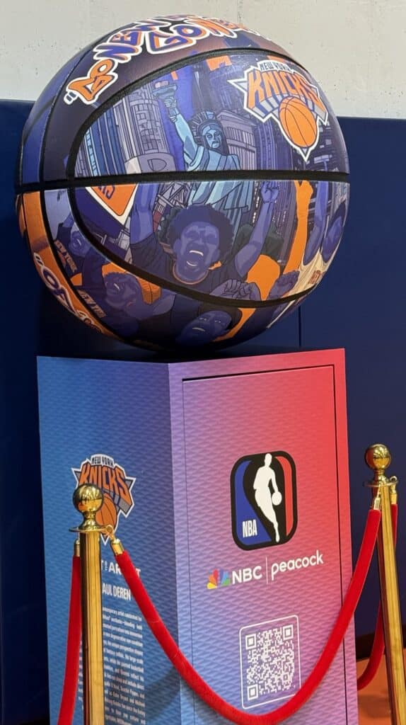 The Roundball Rock was previously displayed outside NBC’s 30 Rockefeller Plaza headquarters in Manhattan as part of a nationwide project where artists created 30 custom Rocks, one for each NBA team, to mark the league’s partnership return to NBC and Peacock.