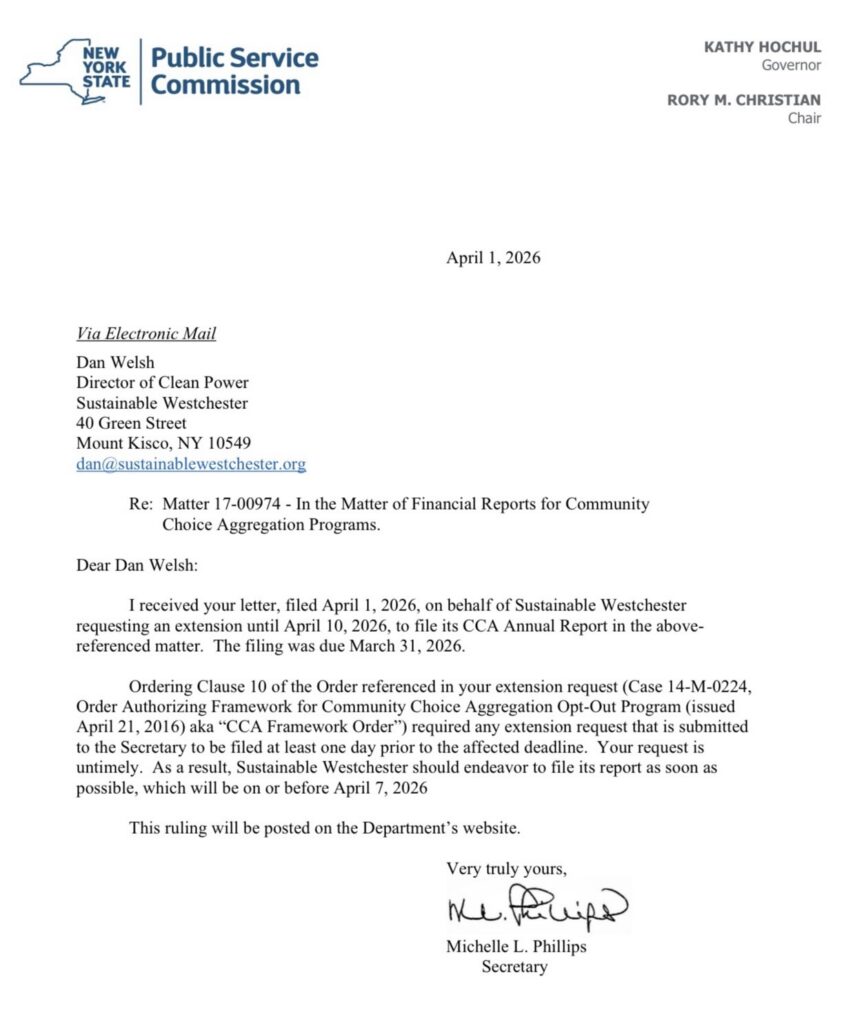 ALBANY, NY (April 1, 2026) — The New York State Public Service Commission denied a request by Sustainable Westchester for an extension to file its 2025 Community Choice Aggregation annual report, finding the request was not submitted by the required deadline and directing the organization to file as soon as possible, but no later than April 7, 2026.