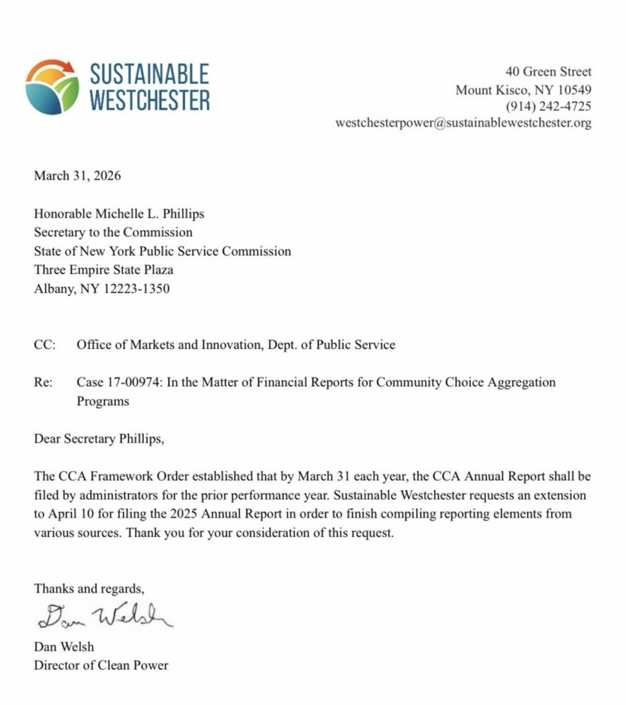 Sustainable Westchester, in a March 31, 2026 letter signed by Director of Clean Power Dan Welsh, had requested the extension to April 10 in order “to finish compiling reporting elements from various sources.” The request cited requirements under the CCA Framework Order that annual reports be filed by March 31 each year for the prior performance year.