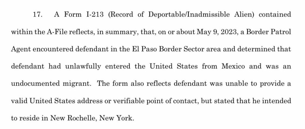 According to the federal complaint, a U.S. Border Patrol agent encountered Medina-Medina on or about May 9, 2023, in the El Paso Border Sector and determined he had unlawfully entered the United States from Mexico and was an undocumented migrant. The complaint states he was unable to provide a valid U.S. address or verifiable point of contact, but “stated that he intended to reside in New Rochelle, New York.”