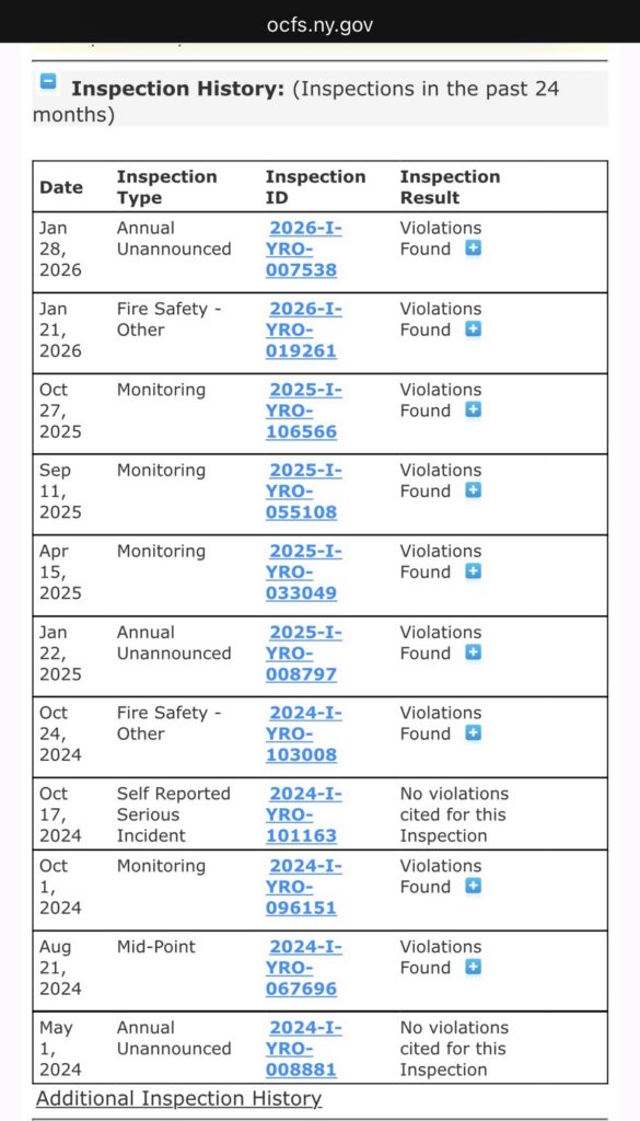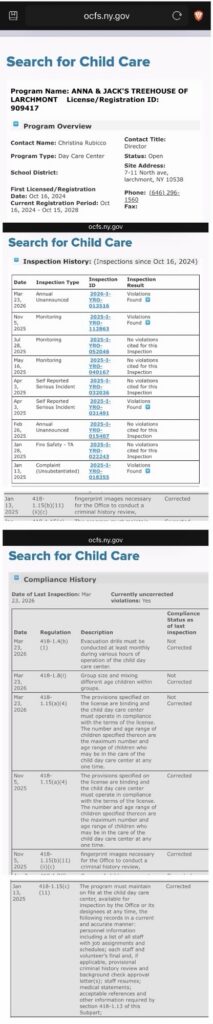 OCFS maintains a publicly accessible database of inspection histories for licensed childcare providers. A review of those records for the relevant facilities shows multiple inspections in which “Violations Found” is recorded as the inspection result, including annual, monitoring, and fire safety inspections.