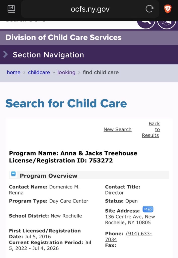 At the time of publication of the Nightmare on the Isle of Sans Souci series in 2021, publicly available OCFS records did not reflect licensing information for the current Anna & Jack’s Treehouse entity for that period. That reporting accurately reflected the state of the records available at the time.