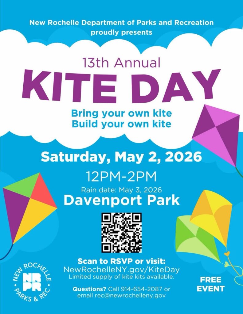 NEW ROCHELLE, NY (April 28, 2026) — The New Rochelle Department of Parks and Recreation will hold the 13th Annual Kite Day at Davenport Park on Saturday, May 2, from 12 p.m. to 2 p.m., according to an announcement.
